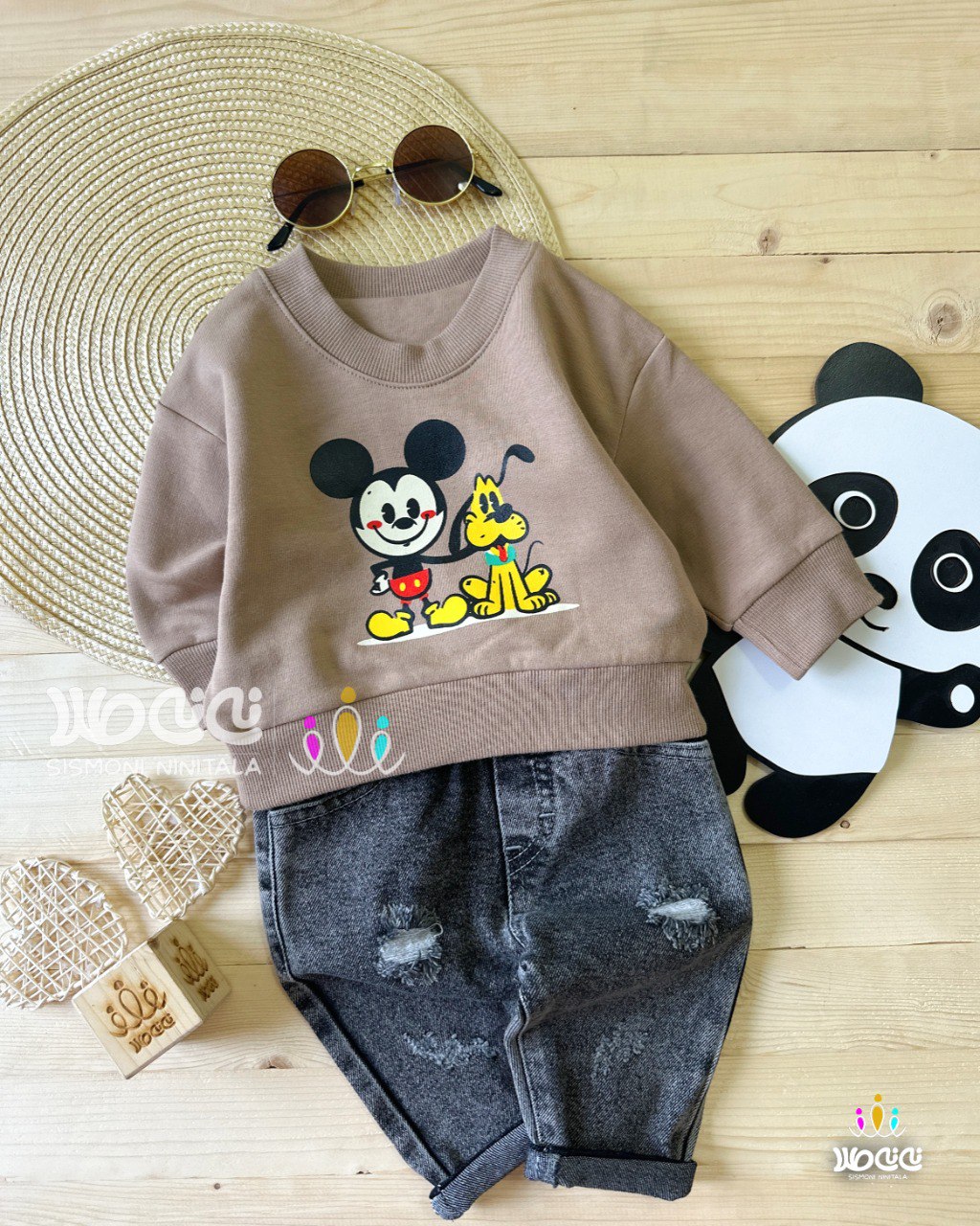 بلوز شلوار جین نسکافه ای میکی دخترانه و پسرانه مناسب مهمانی