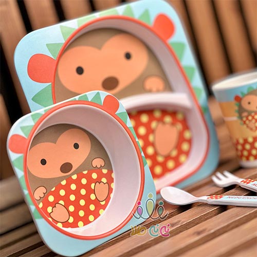 ست ۵ تکه ظرف غذا بامبو کودک طرح جوجه تیغی و فلامینگو
