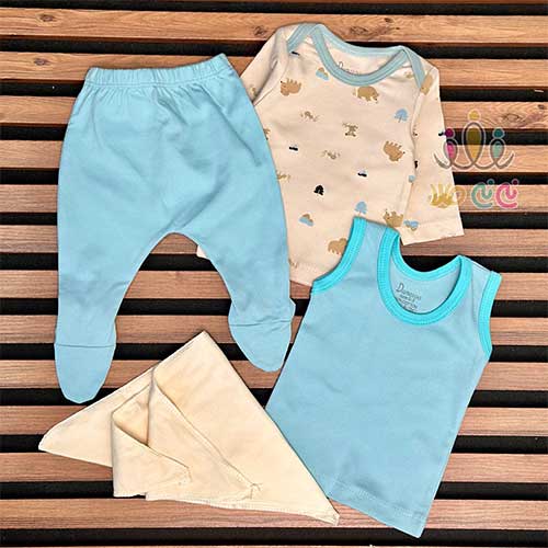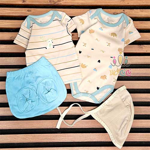 دو عدد کلاه , بادی آستین کوتاه , شورت عینکی , جوراب , دستکش , دو عدد بلوز , شلوار , شلوار جوراب دار , پیشبند , ناف بند , تیشرت , رکابی , دورپیچ نخی , آروغگیر , دستمال سر |
