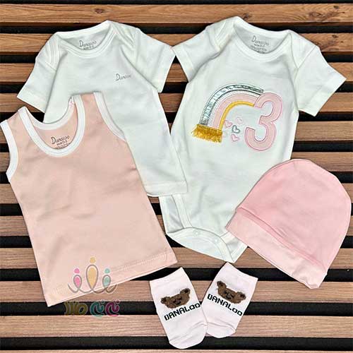 دو عدد کلاه , بادی آستین کوتاه , شورت عینکی , جوراب , دستکش , دو عدد بلوز , شلوار , شلوار جوراب دار , پیشبند , ناف بند , تیشرت , رکابی , دورپیچ نخی , آروغگیر , دستمال سر |
