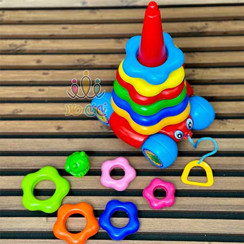 - شامل ۱۱ حلقه رنگی به شکل گُل که کودک از سایز بزرگ تا کوچک باید تشخیص داده و بچیند.